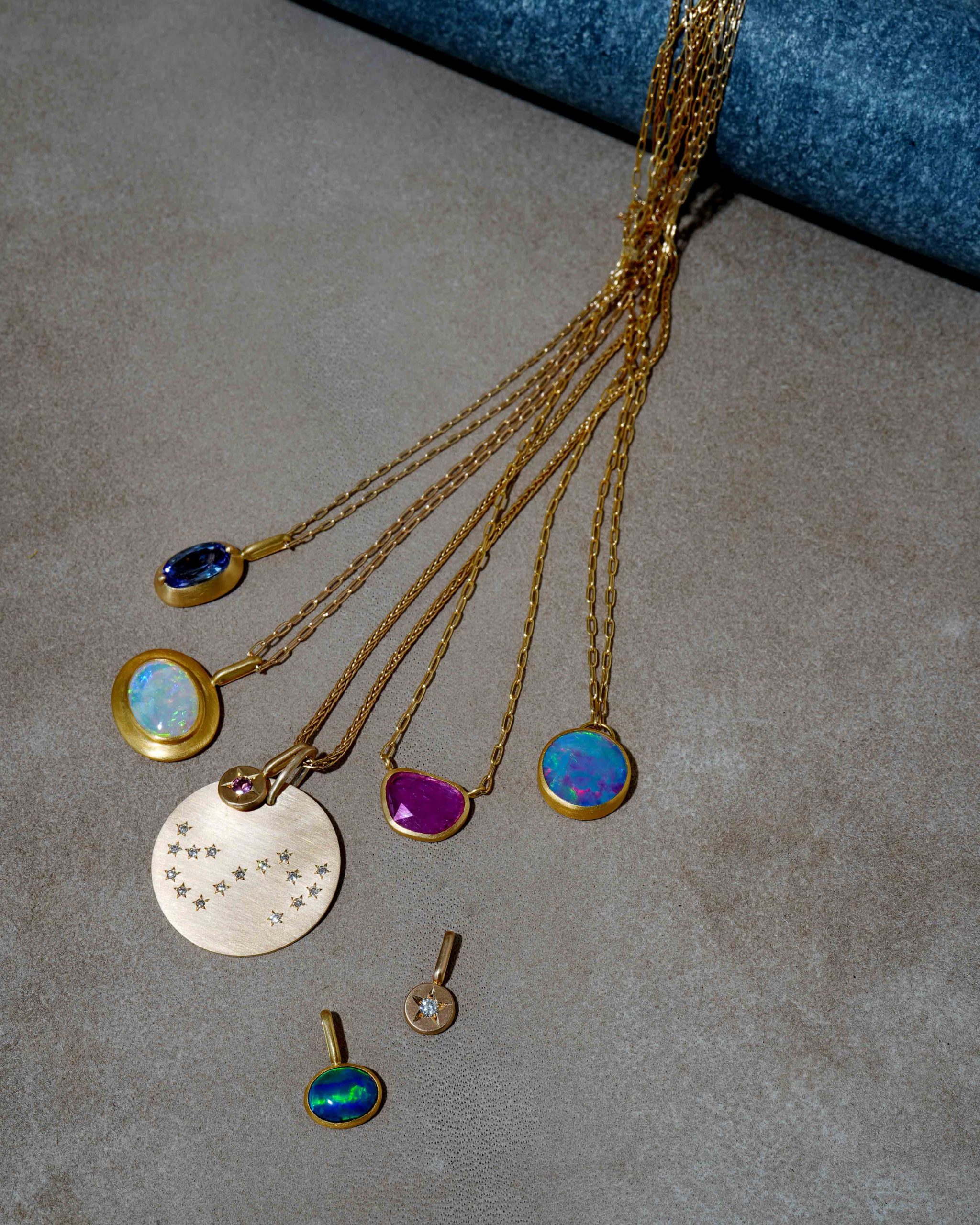 しなやかな質感を湛えたゴールドに、色石やダイヤモンドをあしらったtalkativeのネックレスが集まります。シンプルでありながらも、ひとつひとつに確かな存在感が宿り、身につける人の個性を引き立ててくれるジュエリーたち。