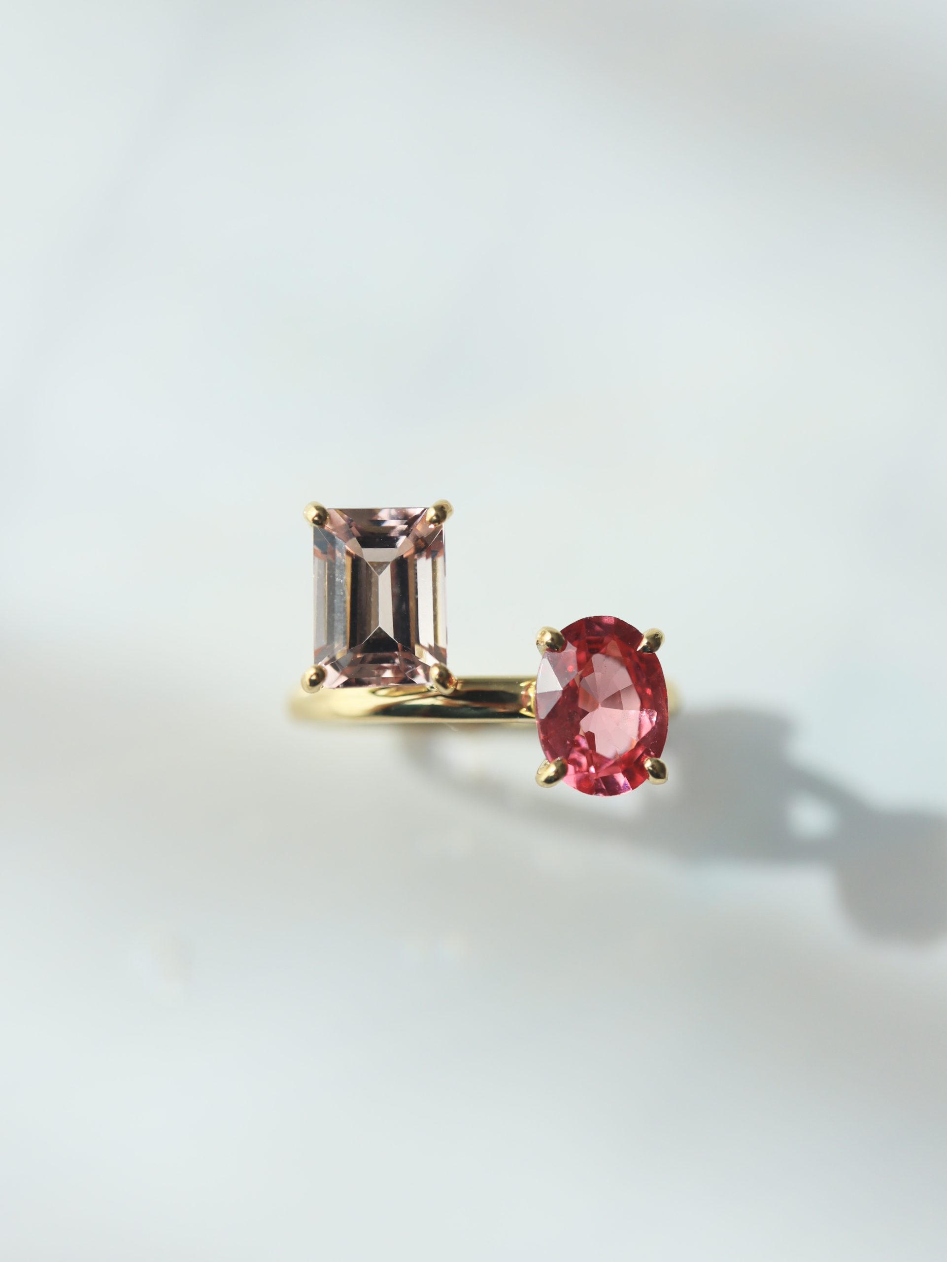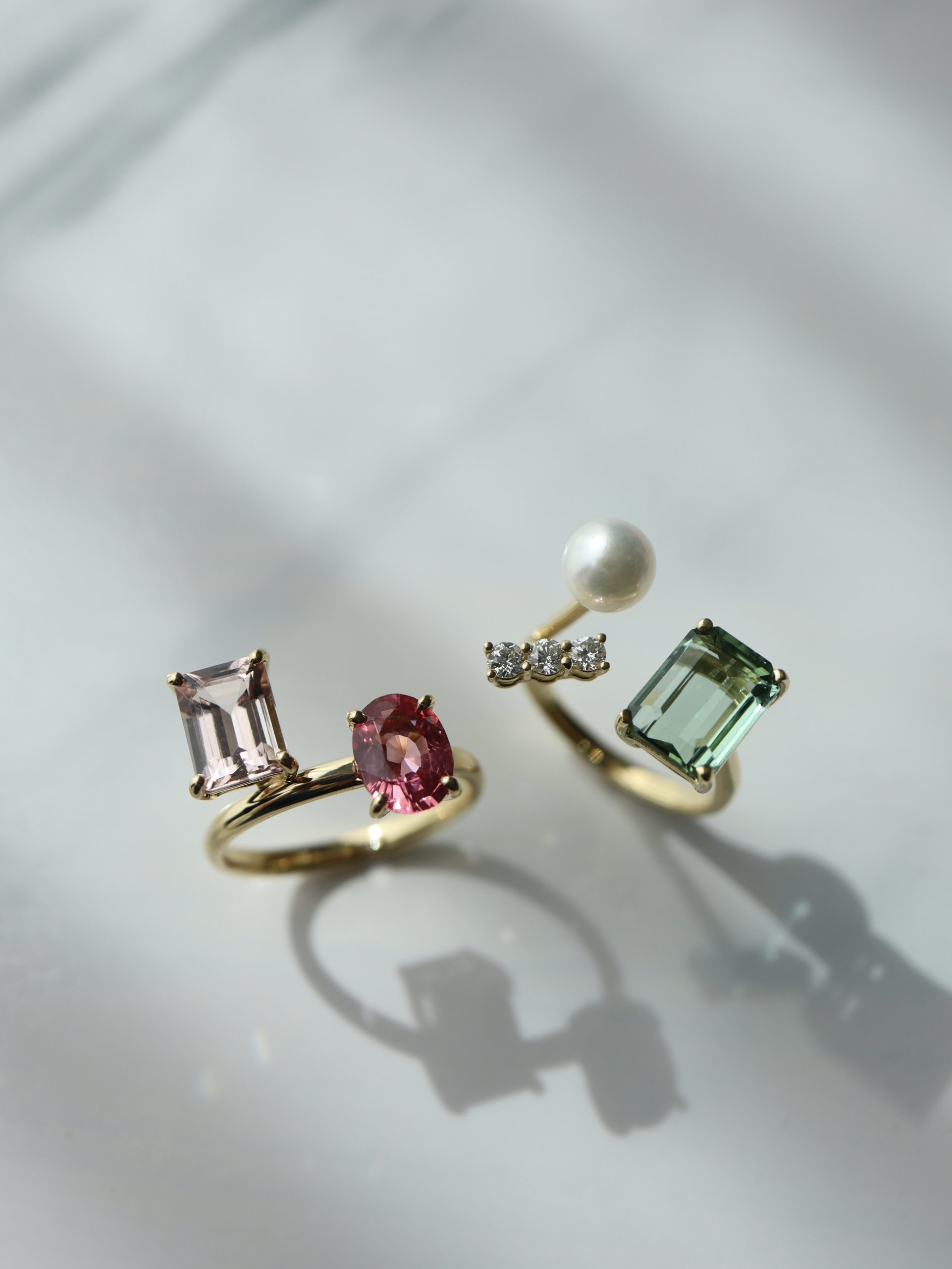 もうひとつは、スピネルとモルガナイトを組み合わせた「EAST WEST」。ピンクの濃淡を大胆かつ軽やかに表現し、上下左右にリズミカルに配された2つの異なる石が、指の上でいきいきと輝きを放ちます。