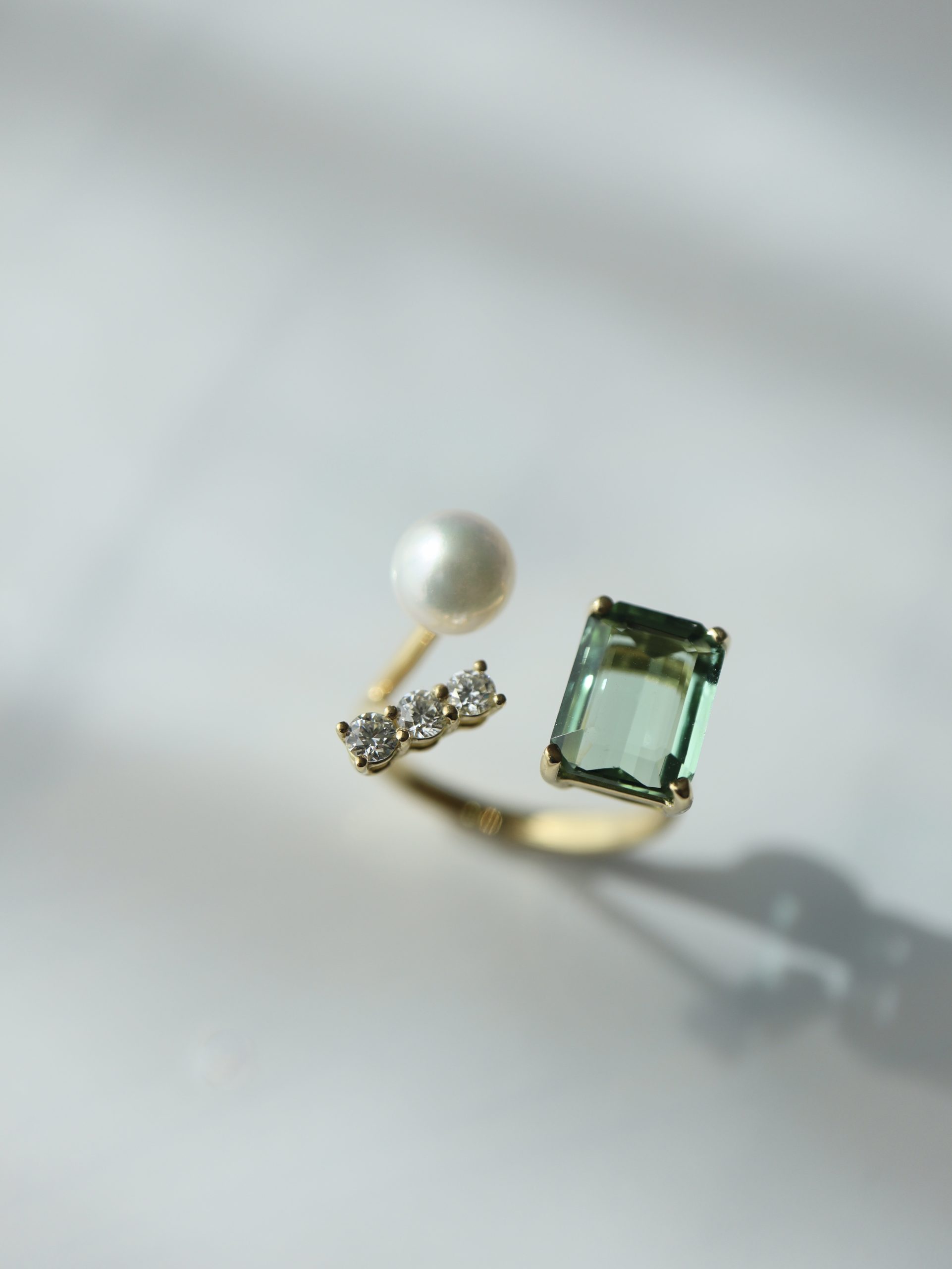 ひとつめは、グリーントルマリンを中心に、ダイヤモンドとアコヤパールを組み合わせた「フィカス(ゴムの木)」リング。自由に伸びる3本の枝を表現したデザインで、ブランド創設当初から大切にしてきた代表的な石・トルマリンを主役に仕立てています。