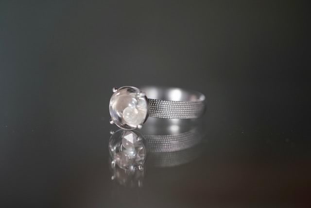 さらに、今回のLimited Storeでは、一点ものの「水鏡リング」も数量限定で登場します。球体ダイヤモンドと水晶とが共鳴するその造形は、まるで水面を覗き込んだ瞬間のきらめきを留めたよう。角度によって光が移ろう様子は、思わず息をのむほどの美しさです。