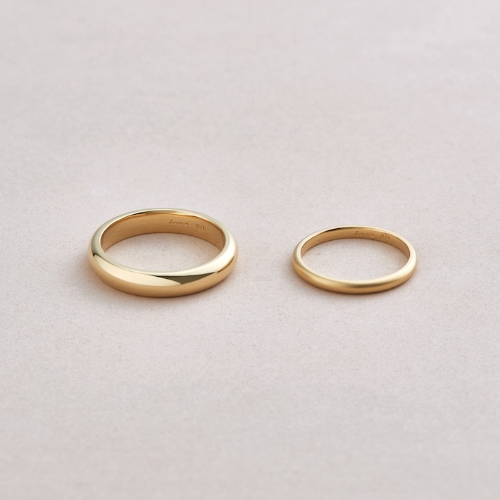 エンゲージの起源、甲丸リングに丸みを持たせたオリジナルデザインで、太さ約1.5mm~5mmまで約0.5mm刻みの8段階からお選びいただけます。シンプルながら存在感のあるデザインは、どの太さの組合せでもペアリングに見えるように設計されています。