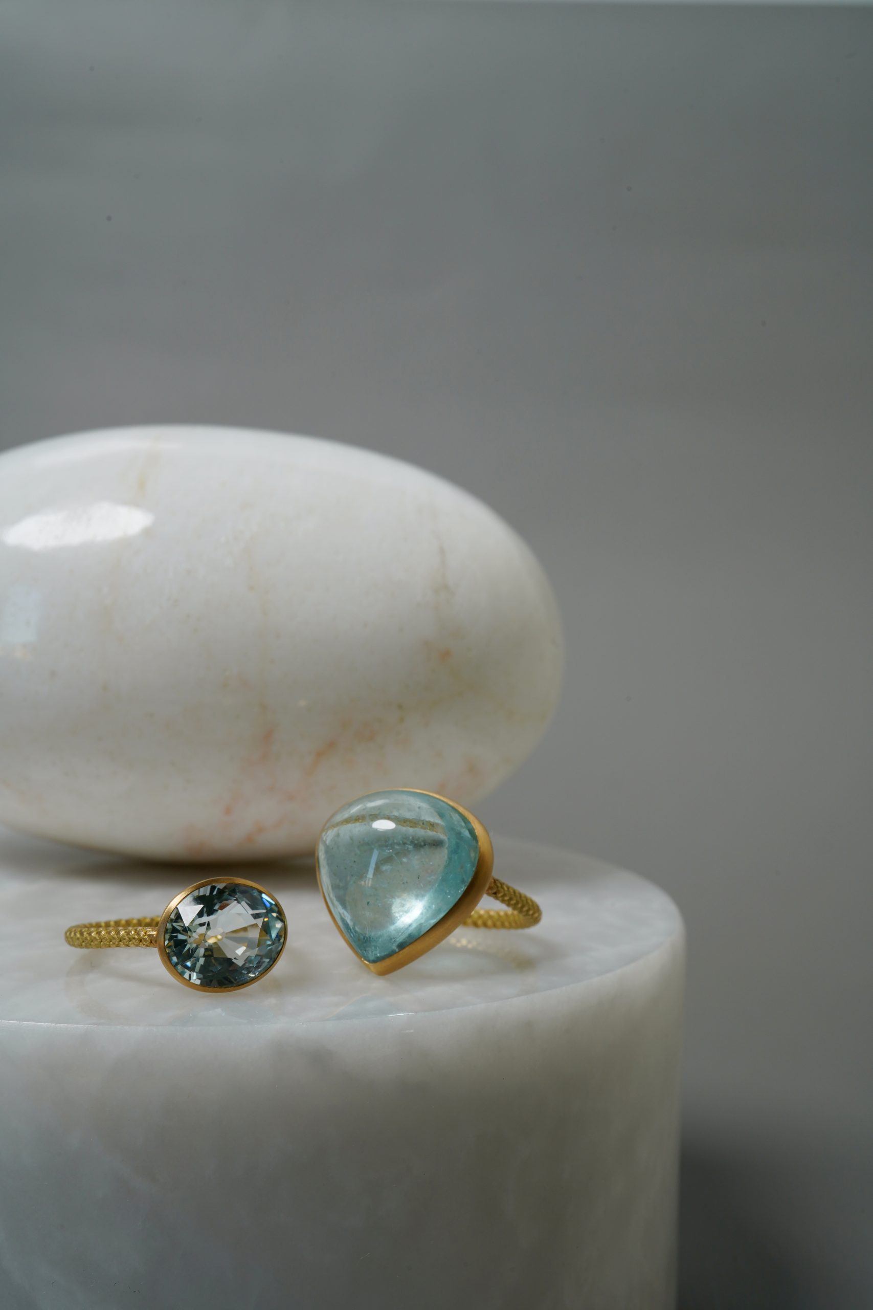 今回ご紹介するのは、オーバル、クッション、マロンカットなど、フォルムごとに異なる個性を持つアクアマリン。それぞれのカットが引き出す光の反射や色の濃淡が、石の表情に豊かなニュアンスをもたらします。