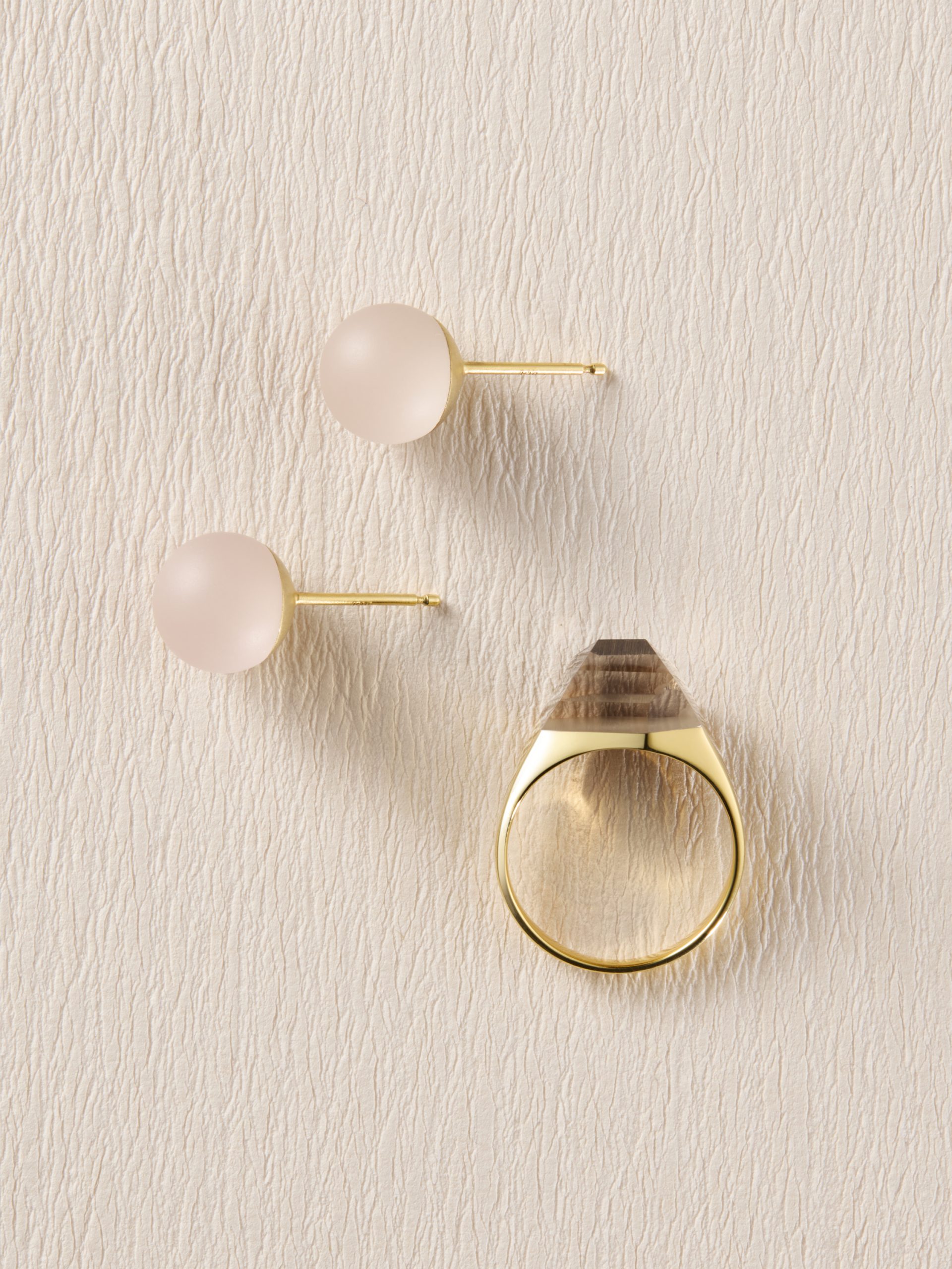また、マダガスカル産ならではの紅の濃さが美しいローズクオーツも見逃せない存在です。ピンクゴールドのアームと自然に調和し、手元をやさしく包み込むような色合いが印象的。ふんわりとした柔らかなピンクが、春の明るい気分をさりげなく引き立ててくれます。(下の写真のピアス)