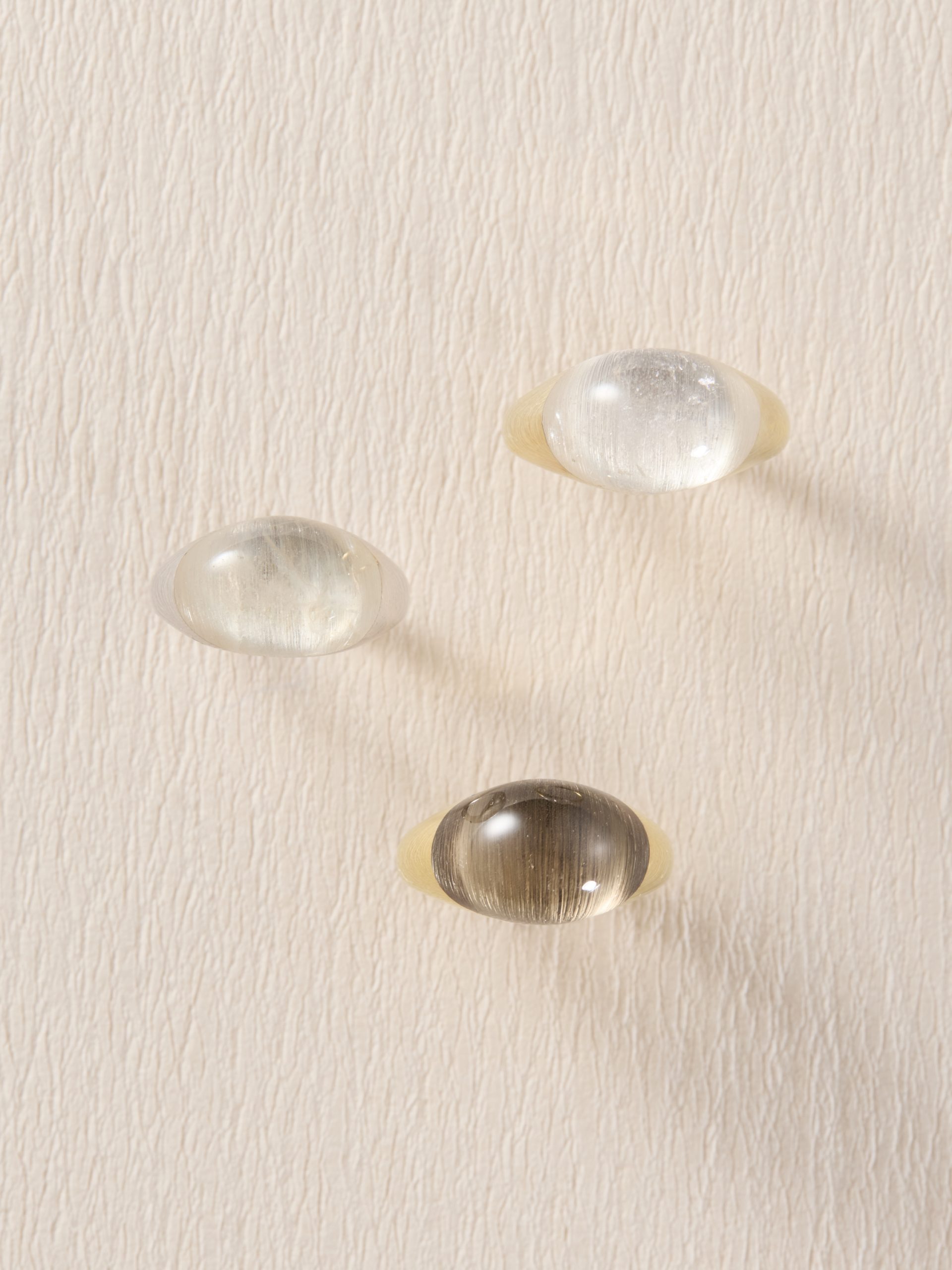 さらに、淡いブラウンの透明感が際立つスモーキークオーツも揃いました。和名で煙水晶と呼ばれるこの石は、微量に含まれるアルミニウムが自然放射線に反応することで生まれる独特の色合いが特徴。光をやわらかく通す軽やかなブラウンは、落ち着いた印象の中に抜け感をもたらし、日常に取り入れやすい魅力を備えています。(上の写真のリング)