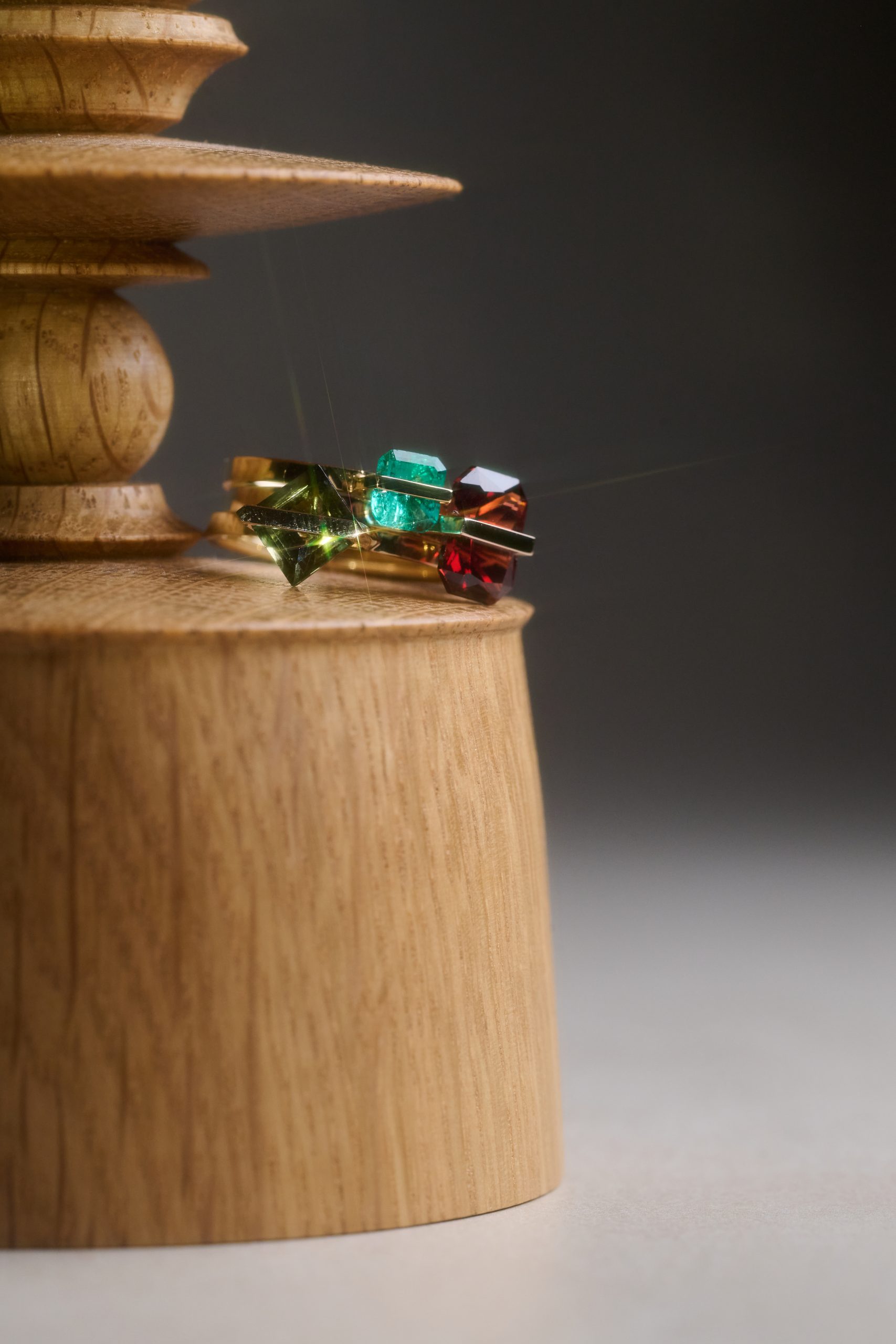 ひとつめは、グリーントルマリンを中心に、ダイヤモンドとアコヤパールを組み合わせた「フィカス(ゴムの木)」リング。自由に伸びる3本の枝を表現したデザインで、ブランド創設当初から大切にしてきた代表的な石・トルマリンを主役に仕立てています。