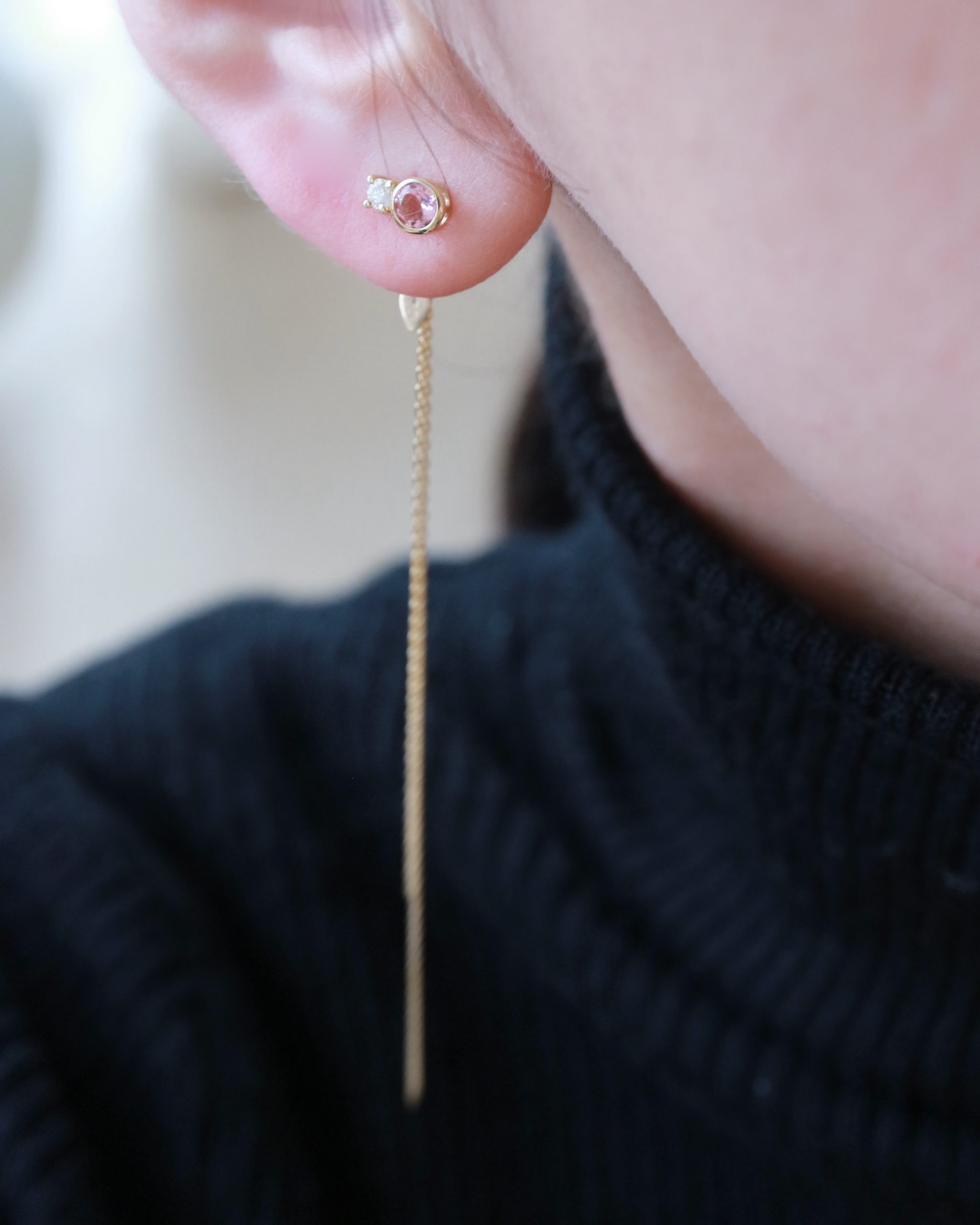 チェーン付きキャッチを合わせると、揺れ感のあるエレガントなピアスとしても着用可能。シンプルなスタッドとして、あるいは動きのある表情豊かなピアスとして、シーンやスタイリングに合わせて印象を変えてお楽しみいただける、新しい提案のアイテムです。