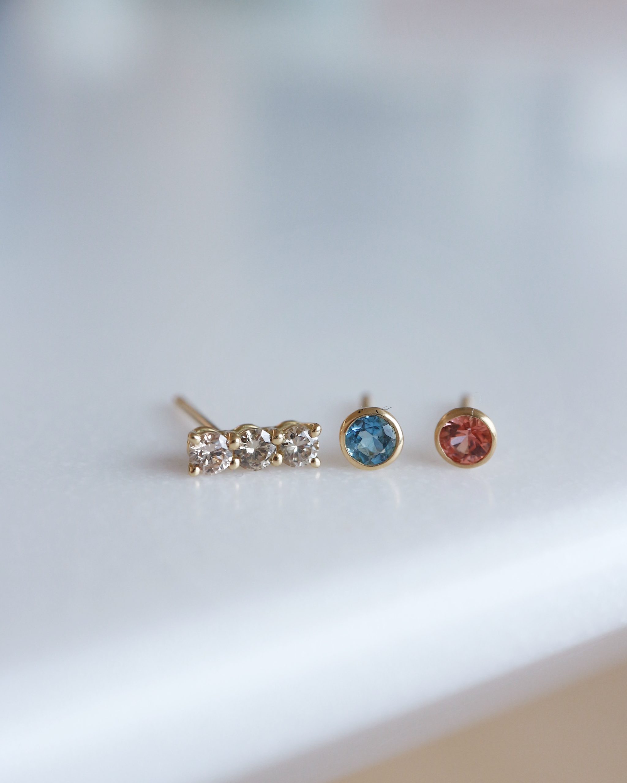 日常に自然と寄り添うシンプルなデザインをベースに、オレンジサファイア、サンタマリアアクアマリン、ブラウンダイヤモンドなど、デザイナーが厳選した美しい天然石を丁寧にセッティングしたスタッドピアス。